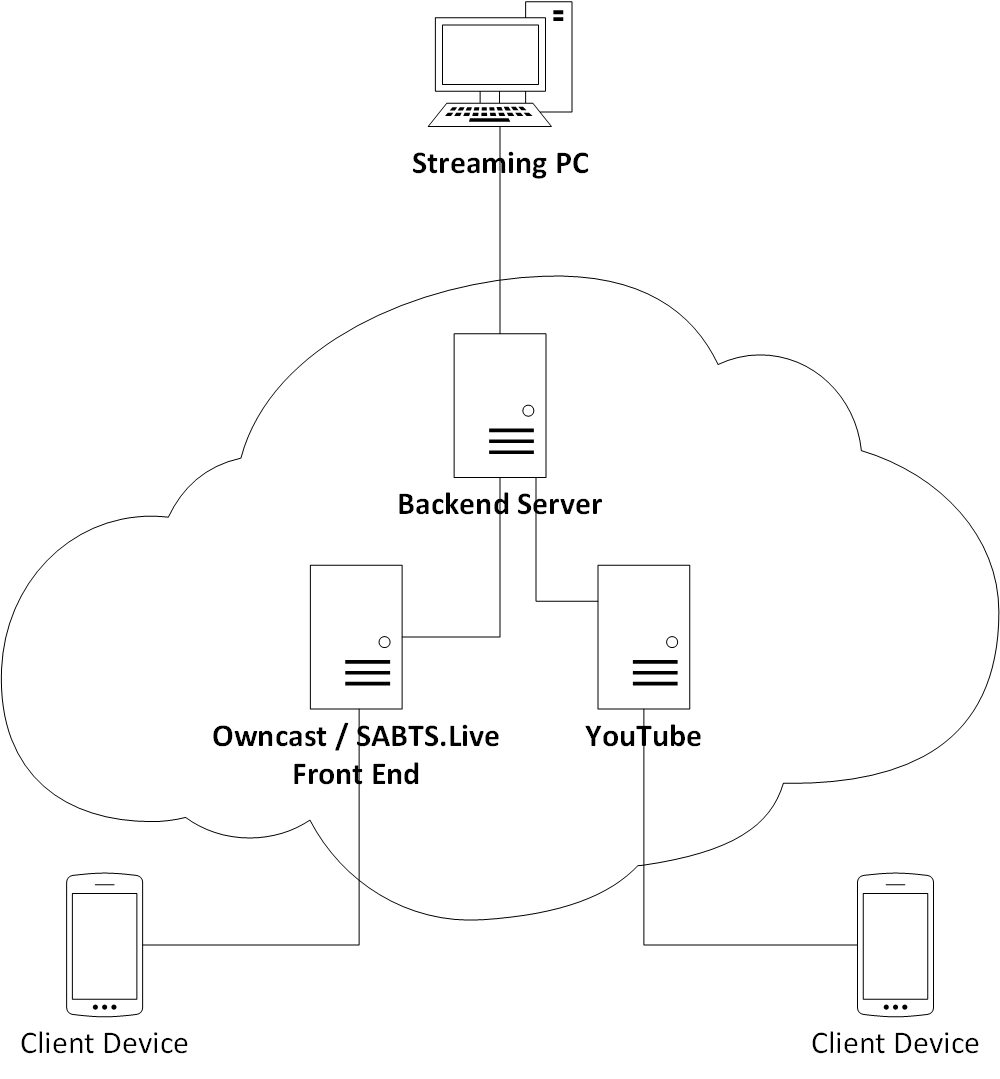 SABTS.Live the website is simply that - a website. It doesn't do anything fancy, just looks nice. The actual video and livestream bits are just embedded links. And those links lead to the SABTS.Live backend server. It's a VPS (Virtual Private Server) hosted with Hetzner in Oregon. It takes the livestream in from the streaming pc on campus, records that livestream, and simultaneously forwards it on to YouTube and the Owncast server which is the backend server for the front end of SABTS.Live